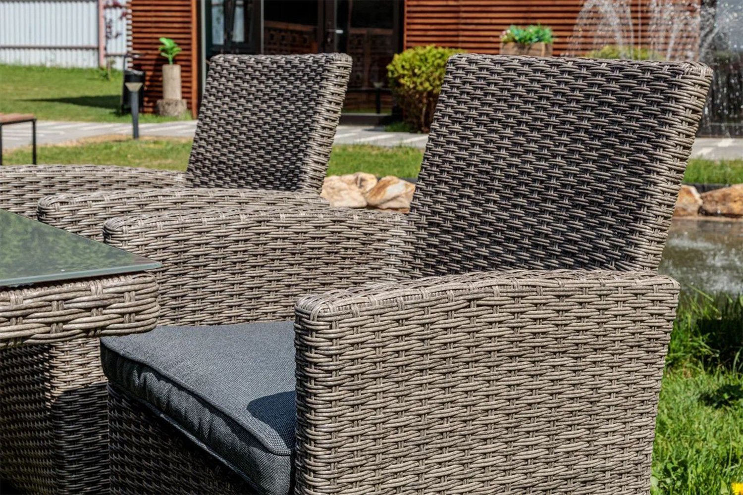 Общий вид комплекта – кресла и стол покрыты оплеткой серого цвета, а на креслах уложены подушки для сидения, в тон всего комплекта. Спинки кресел высокие, у них есть подлокотники. На столе присутствует стекло, для дополнительного дизайна и удобства – вытирать гладкую поверхность гораздо проще, чем ребристое переплетение.