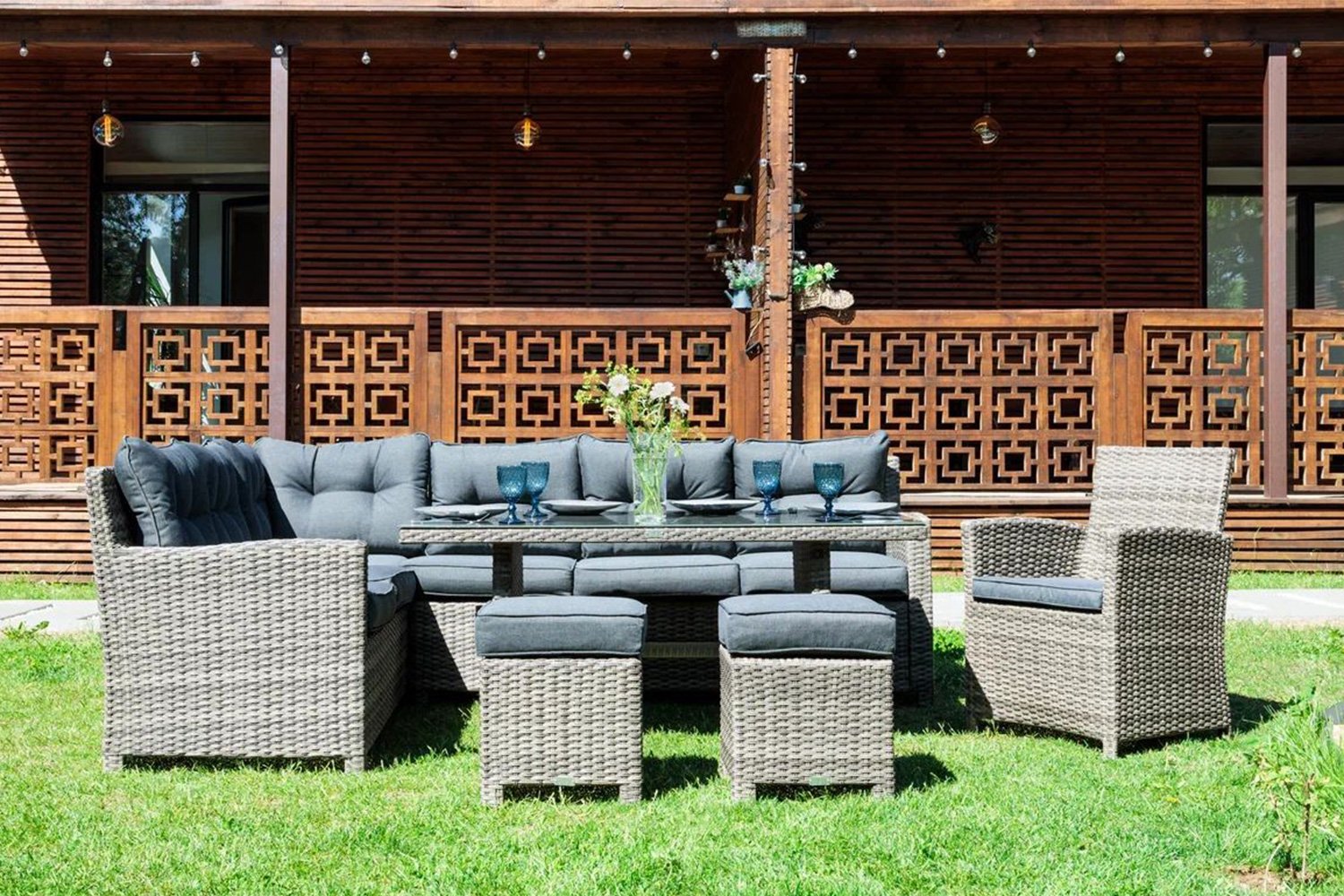 зысканный дизайн в вещах, которые предназначены для зоны комфорта и отдыха – всё это про набор мебели Genry. Данный комплект мебели предназначен для установки на улице и в помещении, и может использоваться в температурном диапазоне от -30 до +50 градусов. В состав входит угловой диван размером 251х85х205 см, кресло 58х89х60 см, и два пуфа 40х38х40 см.