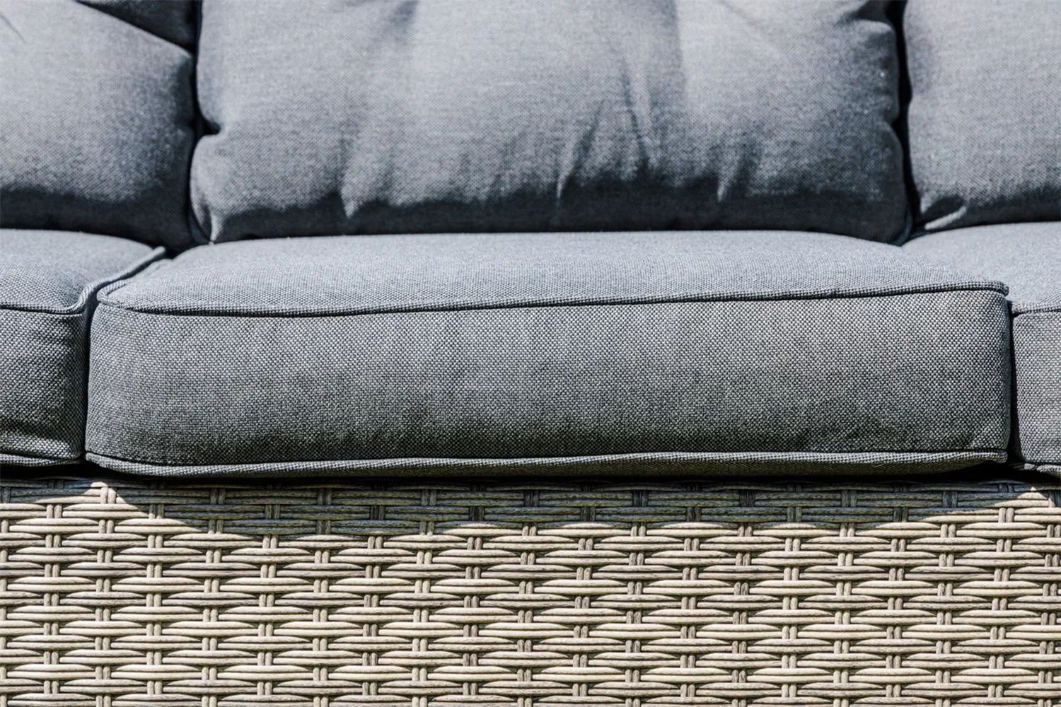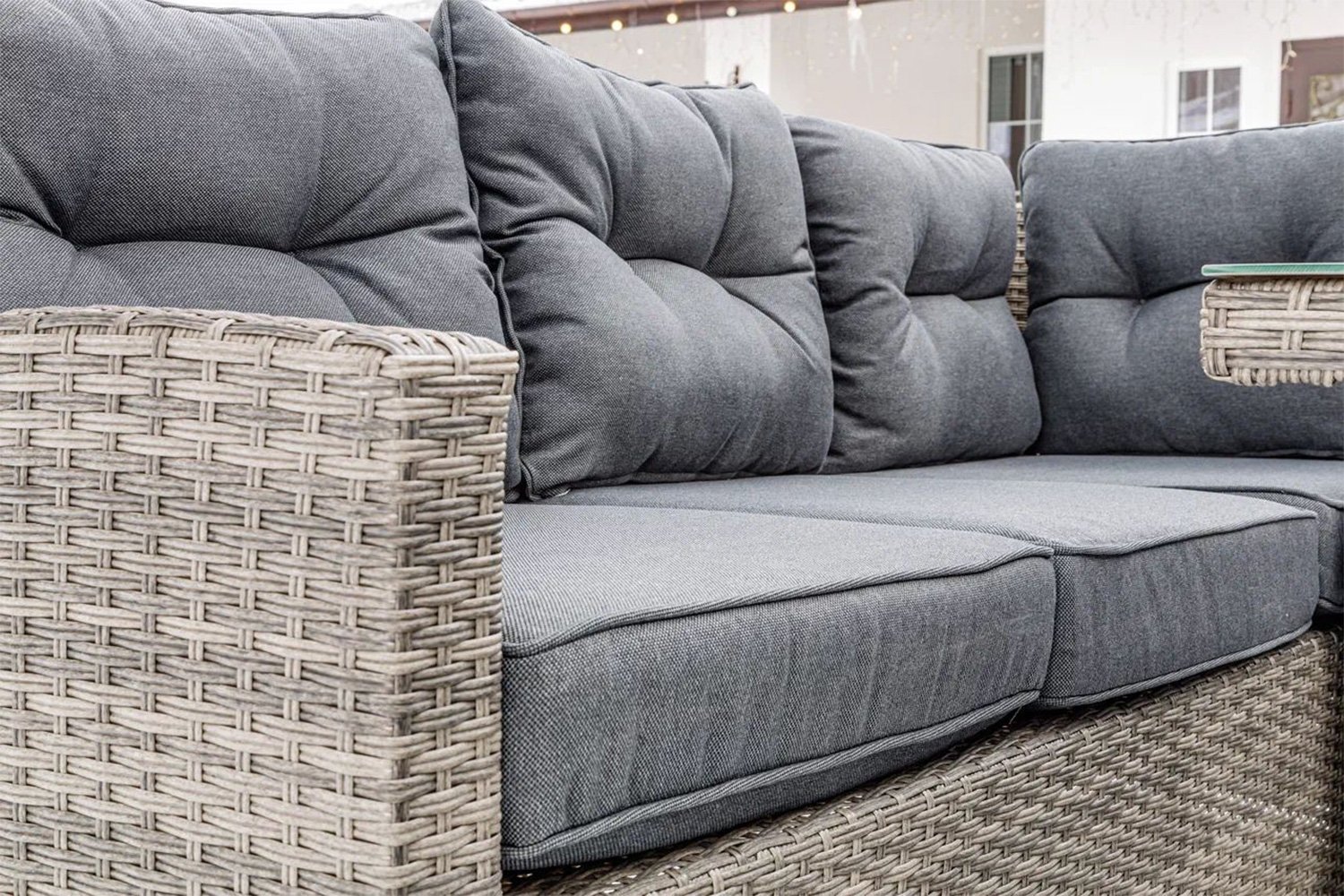 Вся мебель состоит из материалов, предназначенных для эксплуатации на улице – это алюминий (каркас), искусственный ротанг серого цвета (оплетка, полностью скрывающая каркас), стекло (столешница), и олефин (чехлы для мягких элементов). Все они отличаются долговечностью, прочностью и устойчивостью к различным погодным условиям.