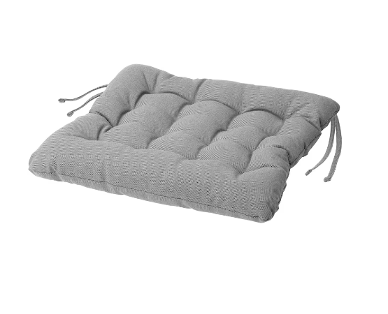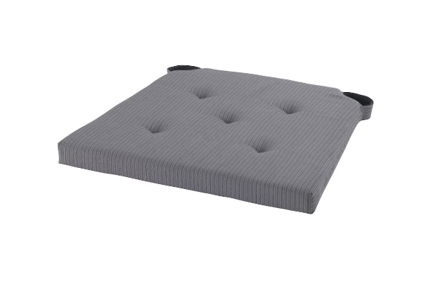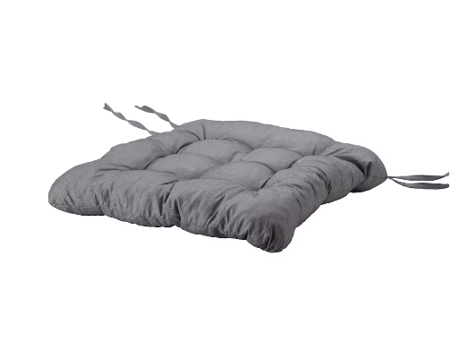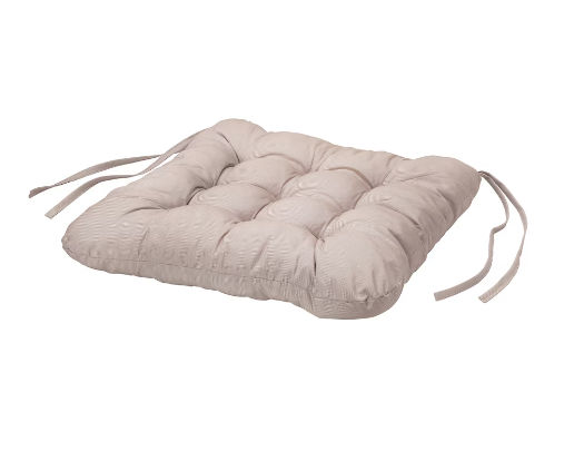 БЕРТИЛЬ. Такая подушка выполнена в круглой форме, она подойдёт для стандартных стульев. Пушистая верхняя сторона изготовлена из полиэстера, а также акрила. Подложка изготавливается из стопроцентного полиэстера, в качестве наполнителя используется пенополиуретан. Изготовлена такая подушка в разных расцветках, белой, черной, а также серой. Благодаря тому, что на внутренней стороне находятся силиконовые стопы, она не будет скользить даже по пластиковым стульям, её высота составляет всего 1 см, в машинке её стирать нельзя.