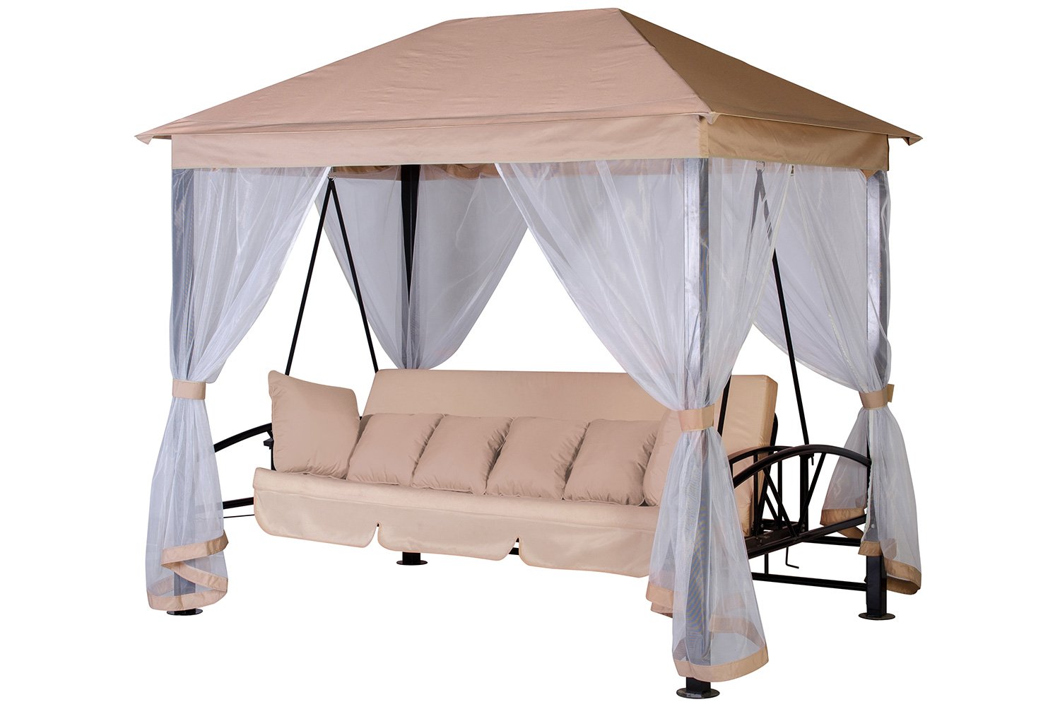 Шатер - Все стороны конструкции окружены москитной сеткой. Возможна комплектация шатра шторами. При необходимости стенки можно легко переместить. Металлические элементы делают конструкцию прочной и надежной.