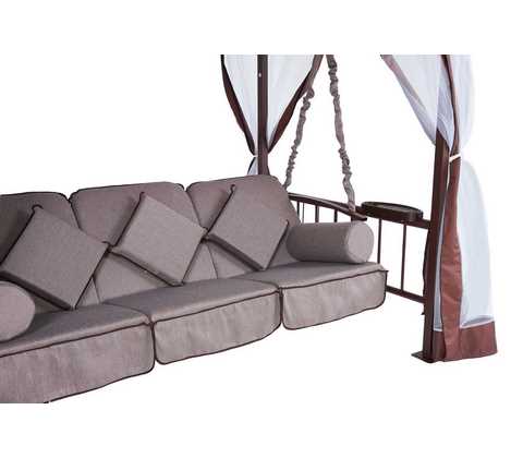 качелей может сильно трескаться и облазить, а металл в тот момент, когда он контактирует с водой, будет подвергаться воздействию коррозии. Кроме того, негативно повлиять на лакокрасочное покрытие могут и ультрафиолетовые лучи, в данном случае краска будет шелушиться и отпадать, а цвет не будет таким ярким. Кроме того, выгореть могут и мягкие элементы, они будут выглядеть не так привлекательно. Благодаря тенту, предназначенному для садовых качелей можно защитить качели от падающих веток и птичьего помёта, из-за чего летний отдых станет хуже. Качели, у которых есть тент, выглядят намного более привлекательно, что тоже является огромным преимуществом в пользу выбора тента. Также такой тент может продаваться вместе с противомоскитной сеткой, благодаря чему вы также будете защищены от насекомых, которые сильно могут омрачить летний отдых.